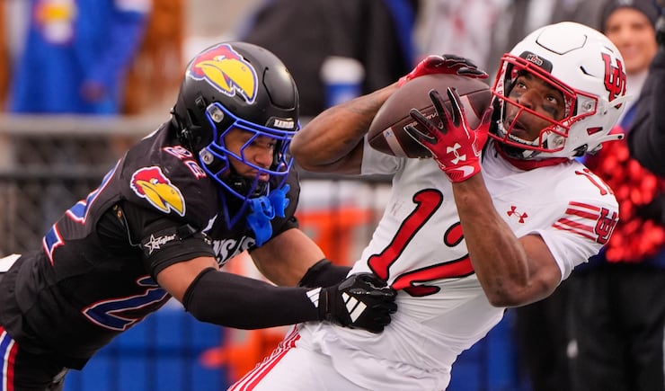 Utah wide receiver Larry Simmons (12) catches a pass under pressure from Kansas defensive back Syeed Gibbs (22) to score a touchdown during the second half of an NCAA college football game Friday, Nov. 28, 2025, in Lawrence, Kan. | Charlie Riedel, Associated Press