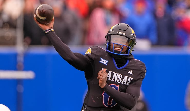 Kansas quarterback Jalon Daniels passes the ball during game against Utah, Friday, Nov. 28, 2025, in Lawrence, Kan. | AP