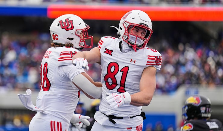 Utah tight ends JJ Buchanan (81) celebrates with tight end Dallen Bentley (88) after Buchanan scored a touchdown during the first half of a game against Kansas, Friday, Nov. 28, 2025, in Lawrence, Kan. | AP
