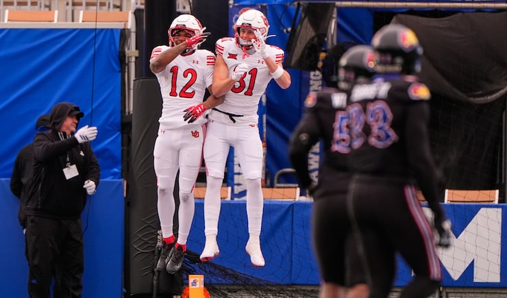 Utah wide receiver Larry Simmons (12) and tight end JJ Buchanan (81) celebrate after Simmons scored a touchdown during game against Kansas, Friday, Nov. 28, 2025, in Lawrence, Kan. | AP