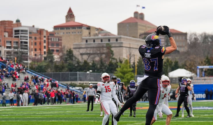 Kansas tight end Leyton Cure (87) catches a pass before running into the end zone to score a touchdown during game against Utah, Friday, Nov. 28, 2025, in Lawrence, Kan. | AP