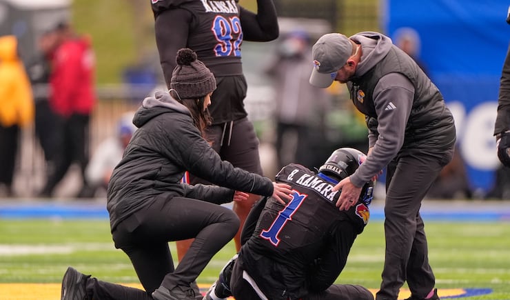 Kansas linebacker Bangally Kamara is helped off the field after an injury during game against Utah, Friday, Nov. 28, 2025, in Lawrence, Kan. | AP