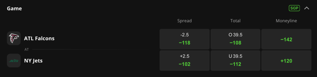 Atlanta is a 2.5-point favorite and -142 on the moneyline, while New York is +120 on DraftKings Sportsbook. The game total is set at 39.5 points.