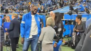 Calvin Johnson chats with Shelia Ford Hamp before Lions game