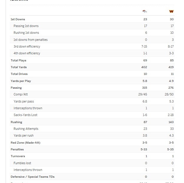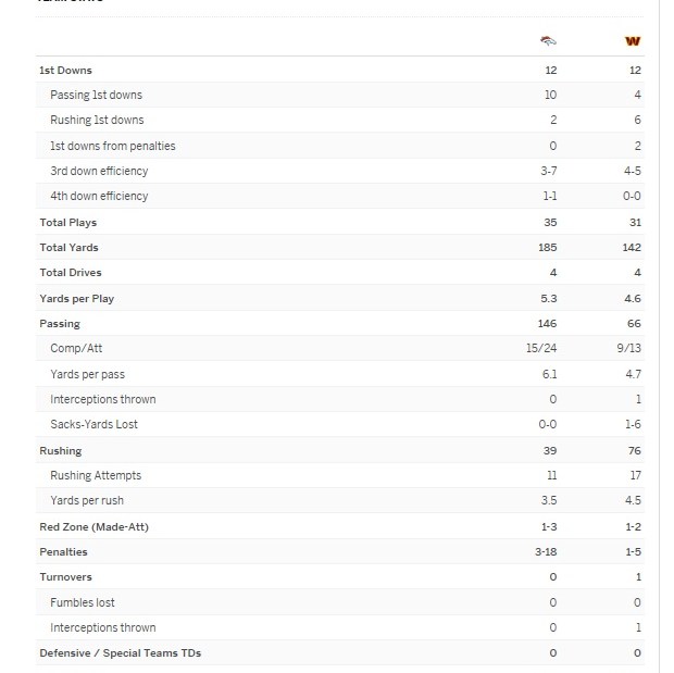 This has been a good game with both teams playing good offense and defense. It may be the best game Washington has played since the Chargers game in Week 5. The big difference in this game is probably the bad interception thrown by Marcus Mariota in the red zone on Washington’s 2nd offensive drive. In a game of limited possessions — 3 drives for WAS, 4 for DEN (excluding kneel down) — points will likely be at a premium. Scoring touchdowns instead of field goals will be important.
