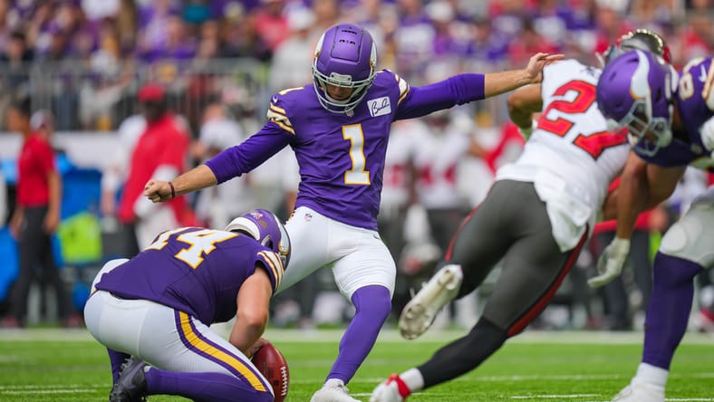 Sep 10, 2023; Minneapolis, Minnesota, USA; Minnesota Vikings place kicker Greg Joseph (1) kicks a field goal against the Tampa Bay Buccaneers in the second quarter at U.S. Bank Stadium. Mandatory Credit: Brad Rempel-USA TODAY Sports