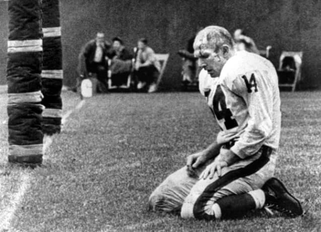 New York Giants quarterback Y.A. Tittle kneels after being sacked by the Steelers in Pittsburgh. (Morris Berman / Pittsburgh Post-Gazette via AP)