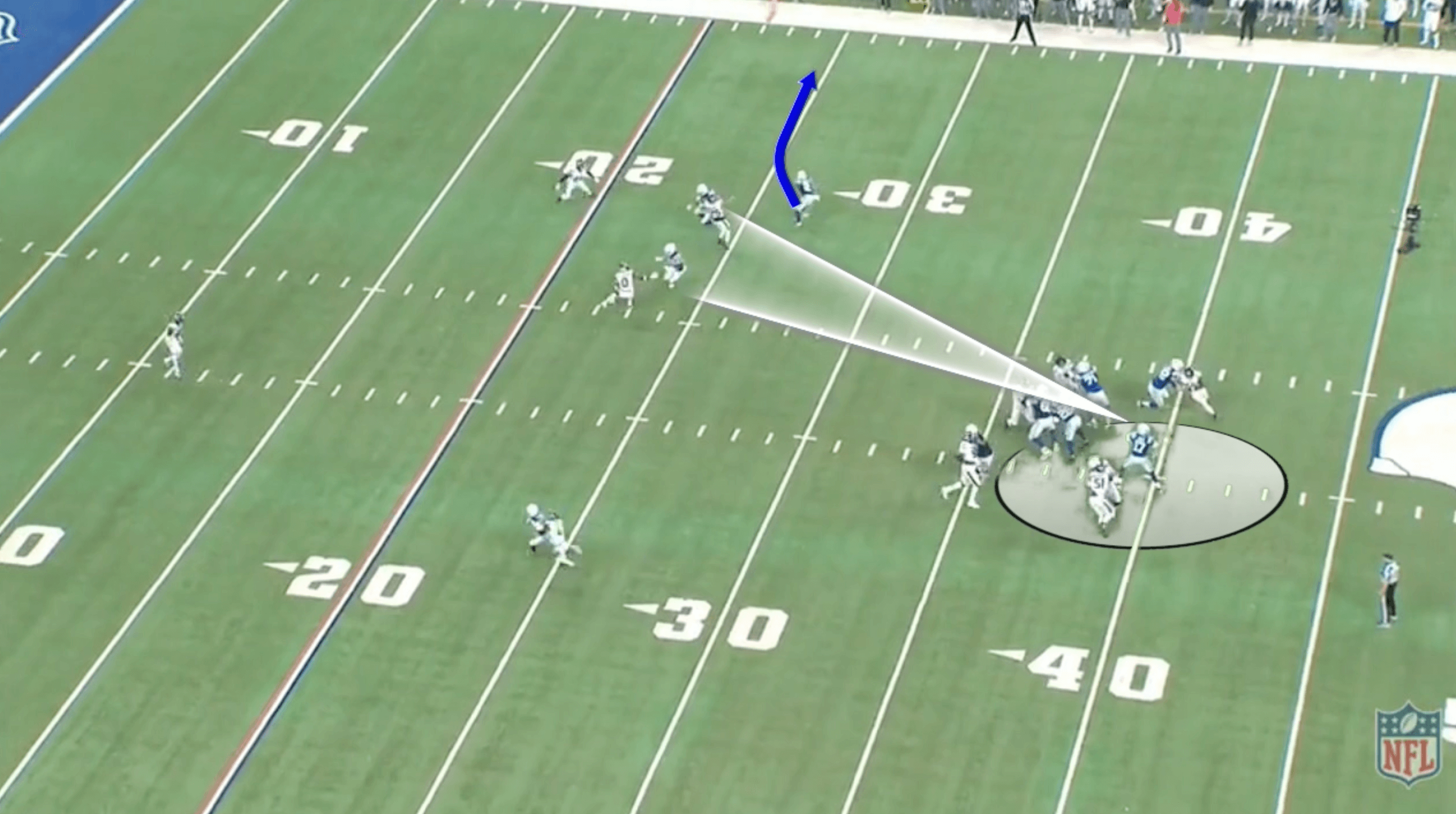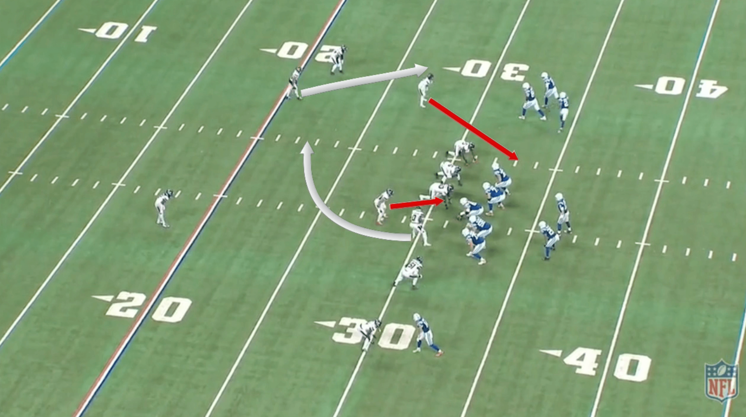 On the Colts’ final offensive snap, Jones drove the ball to the Texans’ 30-yard line but had to convert on fourth-and-9. The Texans had a blitz called with one inside linebacker blitzing and the slot defender blitzing from depth. On the last snap, the Texans man-blitzed, but this time, they had a zone pressure called.