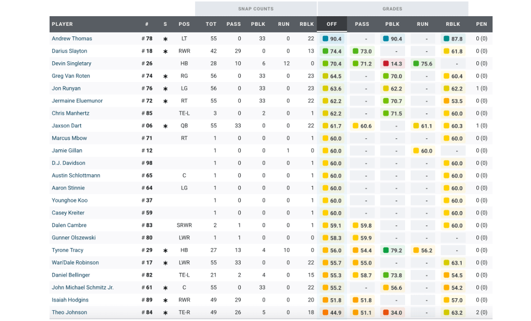 Jaxson Dart played all right in his return from the concussion protocol, but he wasn’t spectacular. He was not especially bothered by pressure; in fact, his only TD came when pressured. He only had one big-time throw, though, and one turnover-worthy play. The most damning thing in the chart above is all the short throws when he had a clean pocket. Dart only threw six balls beyond 10 yards downfield and completed only one of them, for 18 yards. Drake Maye by comparison only threw seven passes beyond 10 yards himself, but he completed five of them for 108 yards and a TD. Of course Maye was facing the Giants’ secondary, not the Patriots’ secondary.
