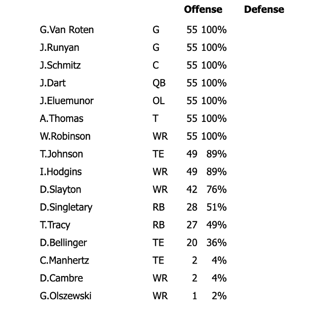 Dart, the starting offensive line, and Robinson played every offensive snap.Isaiah Hodgins and Slayton also played most of the offensive snaps, i.e., the Giants played a lot more 11 personnel than they had been doing in previous games. Dalen Cambre and Gunner Olszewski also got a couple of receiving snaps.The flip side of this is that with Johnson playing most snaps, Daniel Bellinger was only on the field about one-third of the time, in addition to Chris Manhertz getting a couple of snaps.Singletary and Tracy wound up splitting snaps, but mainly as a result of Tracy’s injury.