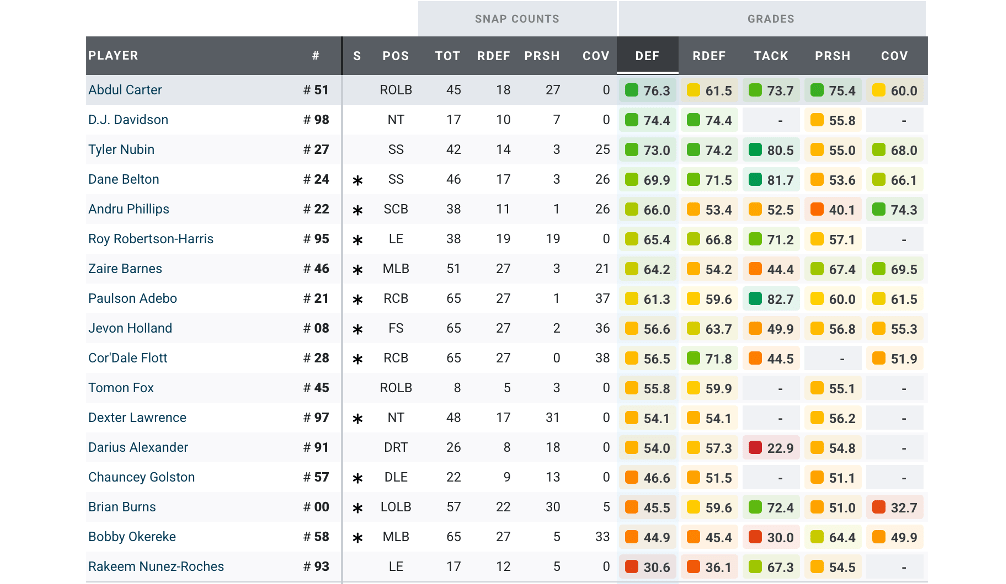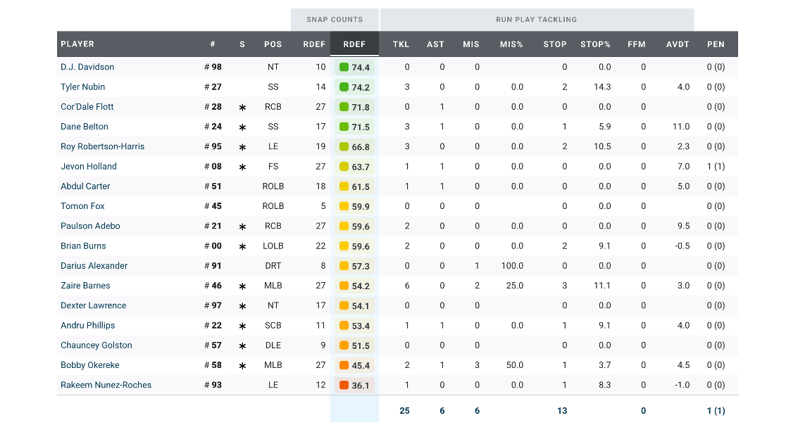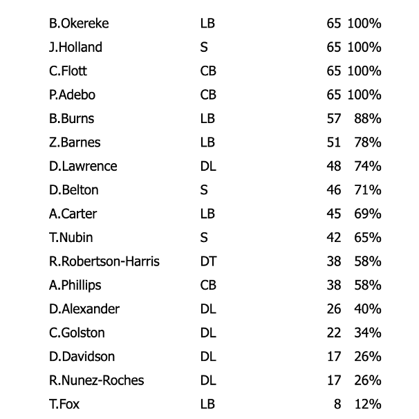 Okereke played every defensive snap and Barnes most of the snaps at off-ball linebacker.In the secondary, Jevon Holland, Cor’Dale Flott, and Adebo played every snap, while Dane Belton, Tyler Nubin, and Dru Phillips played a majority of the snaps.On the edge, Burns was on the field 88% of the time, and Abdul Carter, despite doing his penance in the first quarter, wound up seeing the field about 2/3 of the time. The other snaps were taken by Chauncey Golston, who played strictly on the outside, and partly by Tomon Fox.In the interior, Lawrence played three-quarters of the snaps, Robertson-Harris a little more than half the snaps, Alexander 40% of the snaps, and D.J. Davidson and Rakeem Nunez-Roches each about a quarter of the snaps.