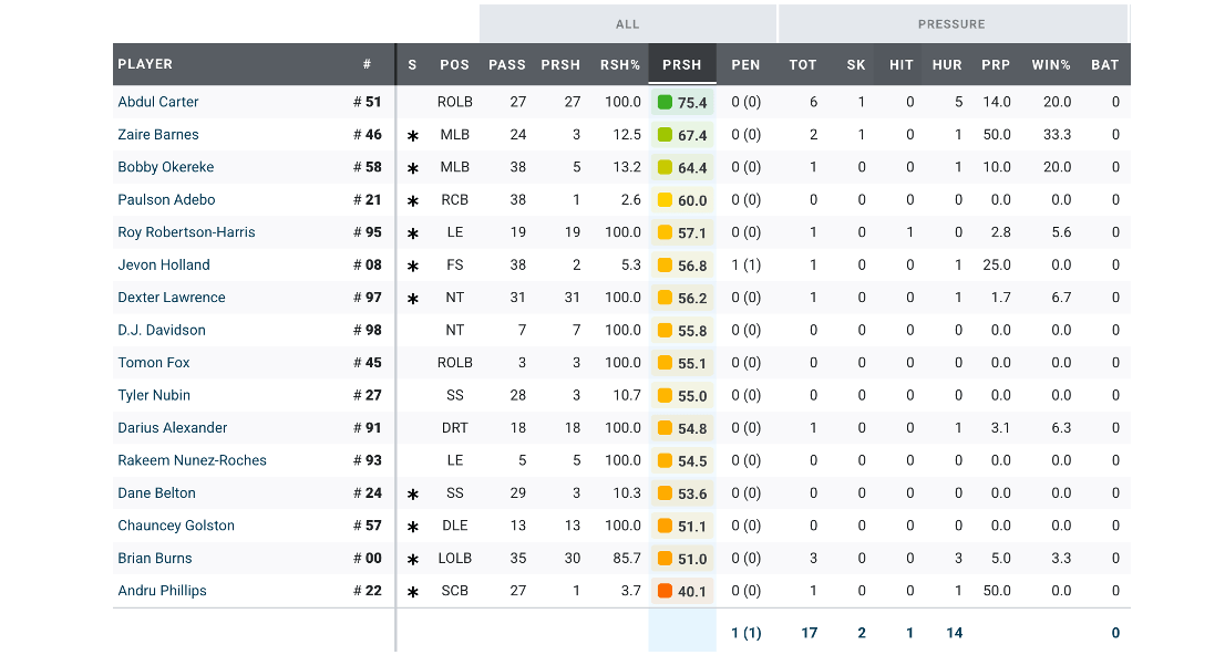 Maybe that beauty nap regimen or whatever it is that Abdul Carter is doing when he misses those meetings and walk-throughs is working, because he had his best game as a Giant last night. Carter got his first solo sack (for 0 lost yards, but it prevented a first down on third down) and had five other pressures. He was the only Giant who rushed Drake Maye effectively. Brian Burns did get three hurries but did little else. The interior defensive line was missing in action, with a hurry here and there and little else. Shout-out to Zaire Barnes, who got his first career sack and actually played all right overall in his most extensive game action as a pro.