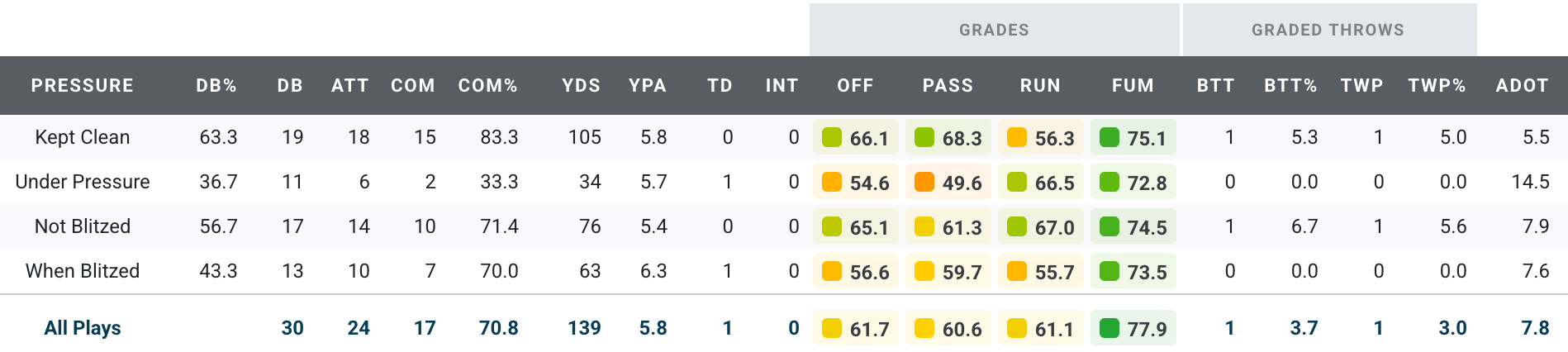 It’s surprising to see that many players with very good or above average grades in a game that was effectively over by halftime, but maybe that tells us more about the futility of the offense than anything. Let’s look at the details. First, the pass rush: