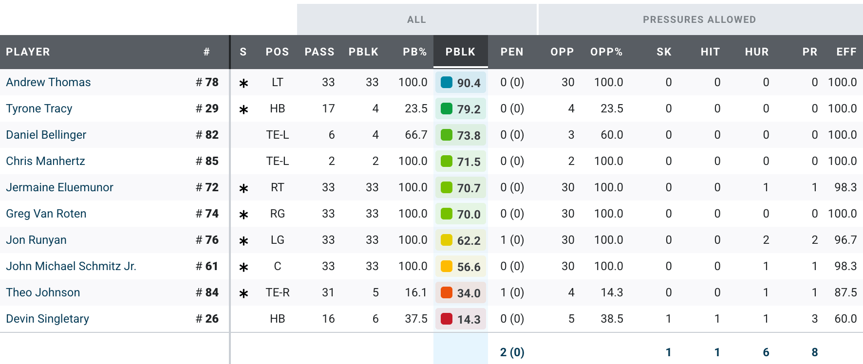 Next, the offensive line. First the pass blocking: