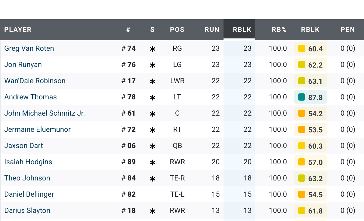 Andrew Thomas had another great game, with a clean stat line and 100% blocking efficiency – why aren’t Giants fans voting him into the Pro Bowl? Jermaine Eluemunor gave up one hurry but otherwise played well also. Greg Van Roten also had a clean stat line and 100% efficiency. Jon Runyan Jr. gave up two hurries and had a penalty but otherwise played well enough, while John Michael Schmitz was just a bit below average and surrendered one hurry. The pass blocking was not the reason why the Giants scored only 15 points.