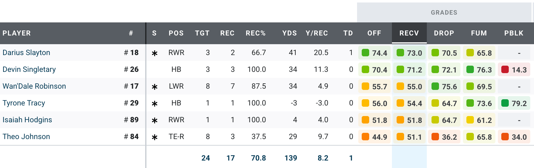 Darius Slayton had a beautiful 30-yard TD that was all his own effort after catching a short pass. Singletary reminded Mike Kafka that he can be an asset in the passing game as well. Wan’Dale Robinson, after his brief star turn as a deep threat during the Jameis Winston era, went back to his “slot receiver” role, with seven catches in eight targets but only for 34 yards. Theo Johnson as much as anyone was responsible for the game getting out of hand as early as it did; he could not make a catch in the end zone that should have been a TD and had one other drop, and he only caught three of eight targets.