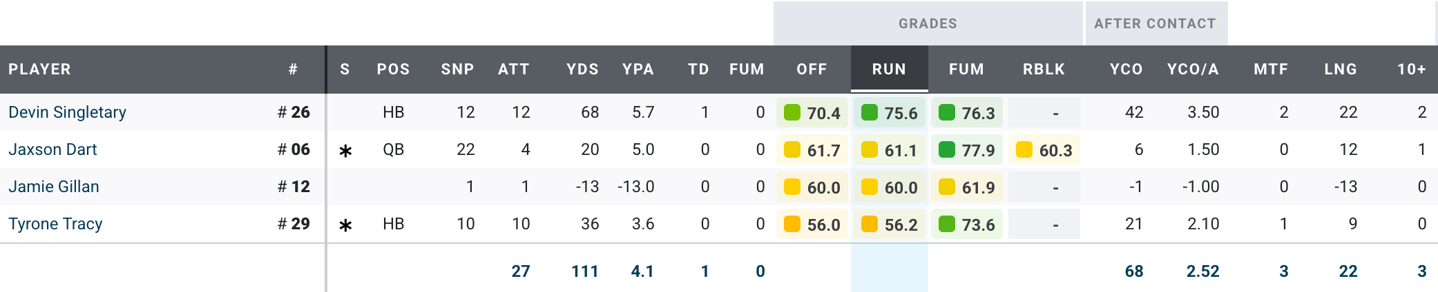 Devin Singletary, relegated to the bench early in the season as Cam Skattebo took over the starting job, has come on in the second half of the season: a TD, two missed tackles forced, 42 yards after contact. With Tyrone Tracy getting injured last night, he finds himself as the lead back he thought he was going to be when he signed with the Giants. Dart only ran four times last night, all of them scrambles, but he hasn’t yet learned his lesson about avoiding contact.