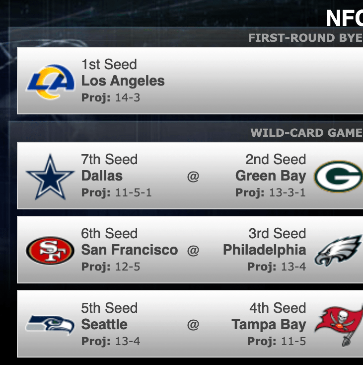 Finally, Week 18 sees the Rams, Eagles, Cowboys, Lions, Packers, and Bucs all winning. Unfortunately for the 49ers, a home loss to Seattle means they go from being the No. 5 seed and traveling to Tampa Bay to the No. 6 seed and traveling to Philadelphia.