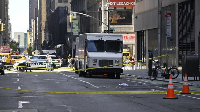 MANHATTAN, NEW YORK, UNITED STATES – NOVEMBER 16: NYPD officers maintain a security cordon after New York Jets NFL cornerback Kris Boyd was shot and critically hurt outside a restaurant in Midtown, Manhattan, New York, United States on November 16, 2025. (Photo by Kyle Mazza/Anadolu via Getty Images)