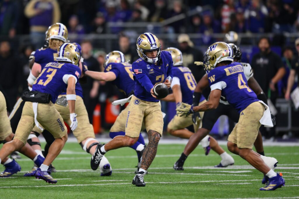 7. WashingtonNov 15, 2025; Seattle, Washington, USA; Washington Huskies quarterback Demond Williams Jr. (2) hands the ball to running back Jordan Washington (4) during the second half at Husky Stadium. Mandatory Credit: Steven Bisig-Imagn Images