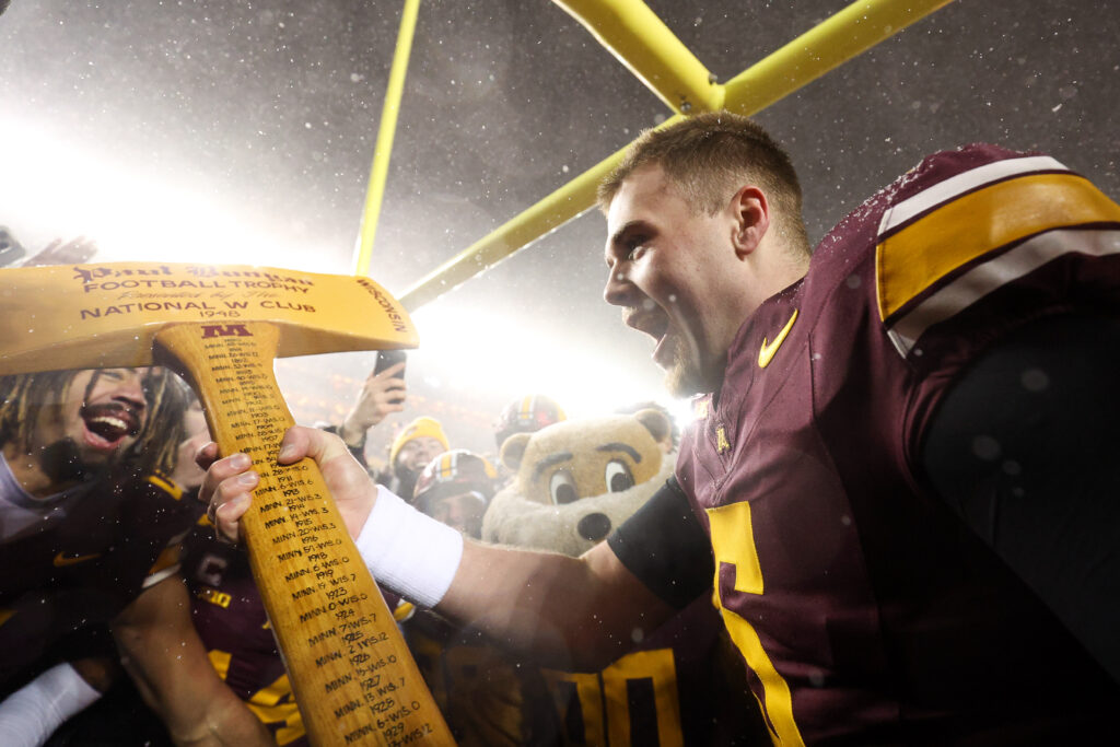 11. MinnesotaNov 29, 2025; Minneapolis, Minnesota, USA; Minnesota Golden Gophers quarterback Drake Lindsey (5) celebrates with Paul Bunyan’s Axe after the game against the Wisconsin Badgers at Huntington Bank Stadium. Mandatory Credit: Matt Krohn-Imagn Images