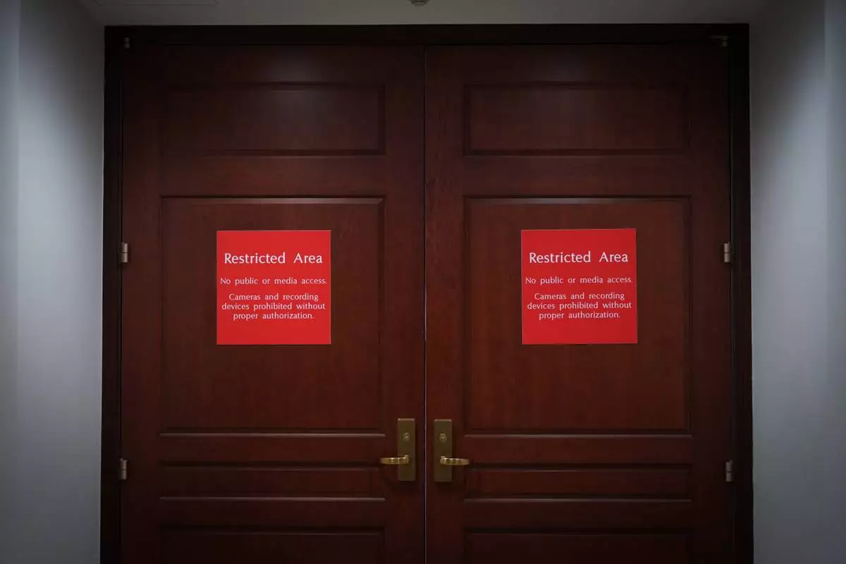 The closed entrance to a secure room is seen where Navy Adm. Frank “Mitch” Bradley, commander of the U.S. Special Operations Command, is expected to brief top congressional lawmakers overseeing national security as they investigate how Defense Secretary Pete Hegseth handled a military strike on a suspected drug smuggling boat and its crew in the Caribbean near Venezuela Sept. 2, at the Capitol in Washington, Thursday, Dec. 4, 2025. (AP Photo/J. Scott Applewhite)