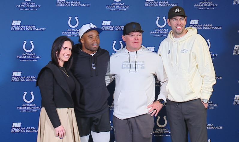 Colts Owner & Chief Brand Officer Kalen Jackson (left), Colts cornerback Kenny Moore II, Colts General Manager Chris Ballard and Colts Head Coach Shane Steichen on Thursday (WISH Photo)