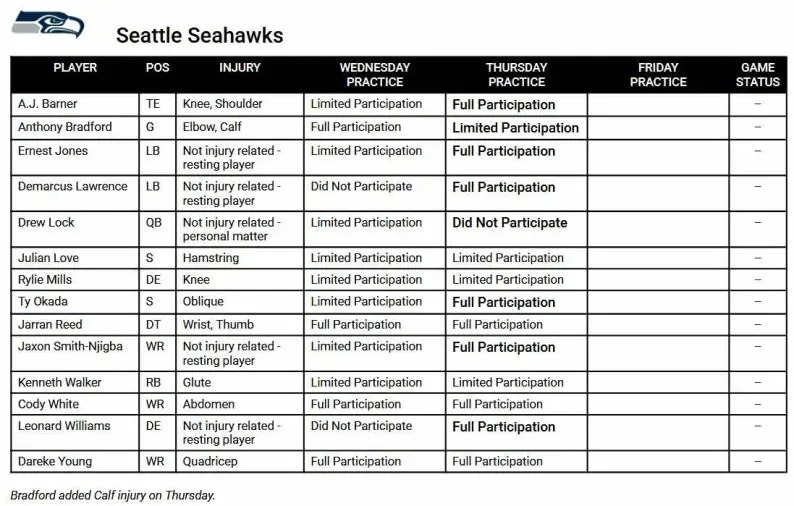 In positive injury news, both AJ Barner and Ty Okada practiced fully for the first time this week. Both played in last week’s game against Minnesota, so they would seem to be on track to do so once again against Atlanta. Dareke Young and Jarran Reed were full participants for a second straight day as they are in their 21-day practice window after completing their four game stint on injured reserve. Seattle has two open roster spots currently…maybe they’re for Young and Reed?