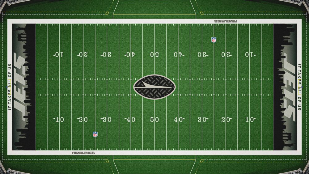 The Jets have placed their secondary logo, which was introduced as part of a full uniform redesign ahead of the 2024 season, at the 50-yard line. It is rendered in black and iron ore and features a sublimated background similar to the manhole covers seen on the streets of New York City.