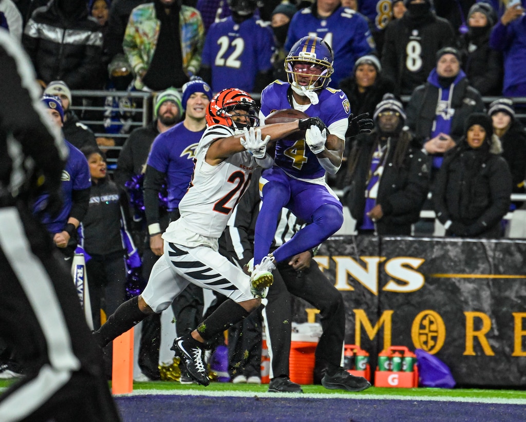 Ravens wide receiver Zay Flowers catches a pass in the end zone over the defense of Cincinnati Bengals cornerback DJ Turner II. The perceived touchdown was called back after a controversial offensive pass interference penalty against Flowers. The Bengals defeated the Ravens 32 -14. (Jerry Jackson/The Banner)