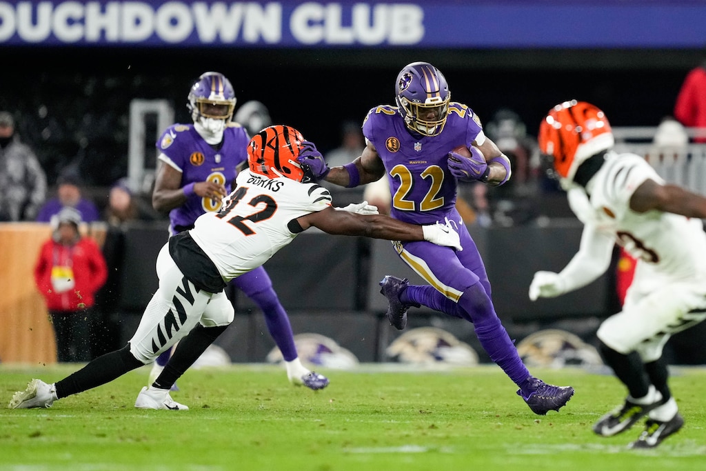 Ravens running back Derrick Henry rushes for a gain in the third quarter of a game against the Cincinnati Bengals on Thanksgiving. (Ulysses Muñoz/The Banner)
