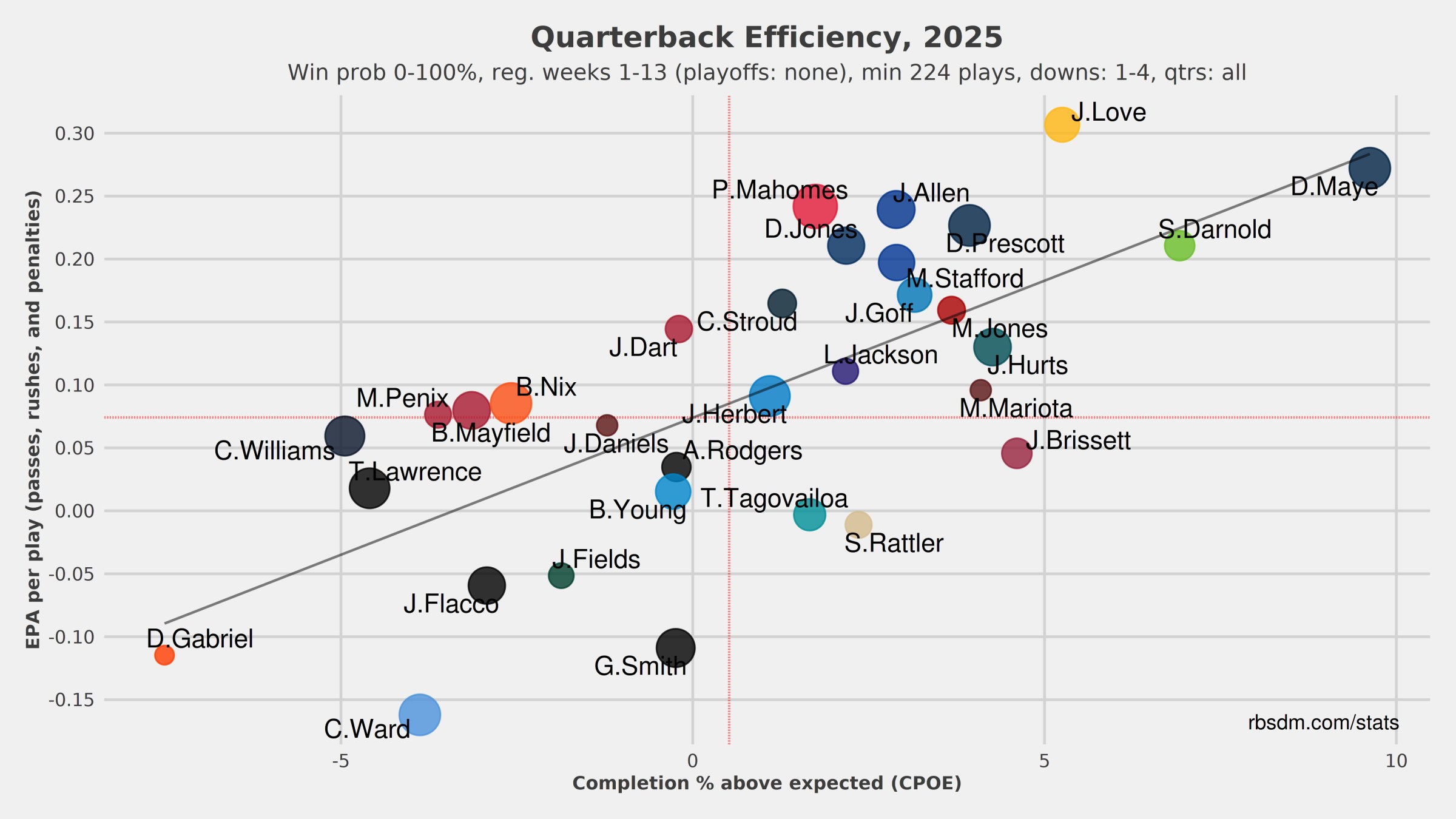 According to RBSDM, Caleb Williams currently ranks 21st in EPA per play and 31st in CPOE out of 32 qualified quarterbacks. While he’s been legitimately elite at avoiding sacks this year, he’s been a disappointing passer, and the Packers have the horses on the edge, most notably Micah Parsons, to force Chicago’s quarterback into some bad situations.