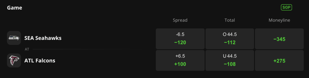 Seattle is a 6.5-point favorite and -345 on the moneyline, while Atlanta is +275 on DraftKings Sportsbook. The game total is set at 44.5 points.