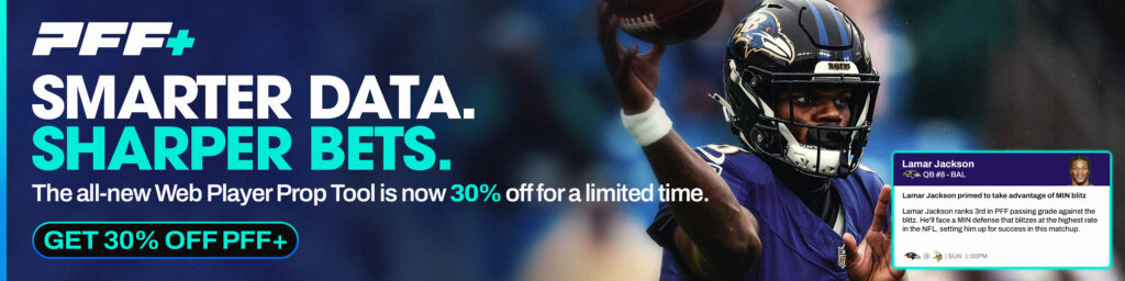 Get PFF+ for 30% off: Use promo code HOLIDAY30 to unlock the PFF Player Prop Tool, Premium Stats, fantasy dashboards, the PFF Mock Draft Simulator, industry-leading fantasy rankings and much more — everything you need to win your season.