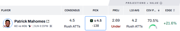 QB Patrick Mahomes, Kansas City Chiefs: Under 4.5 rush attempts (-138)