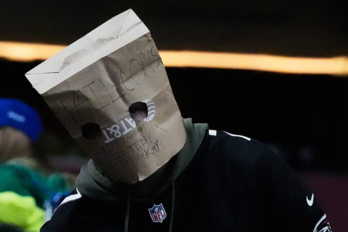 An Atlanta Falcons fan wears a paper bag on their head during the second half of an NFL football game against the Seattle Seahawks, Sunday, Dec. 7, 2025, in Atlanta. (AP Photo/Mike Stewart)