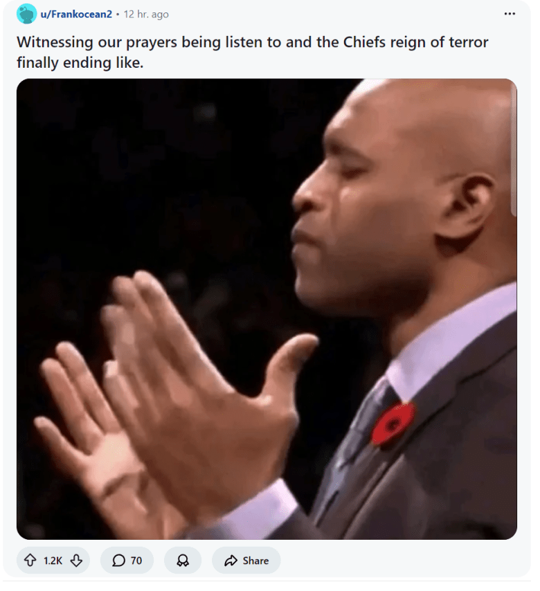 Kansas City’s recent stumble has 49ers fans particularly keen. After losing to the Chiefs in two Super Bowls, 49ers are feeling a sense of relief that Kansas City may miss the playoffs entirely. A top post on the 49ers subreddit captures the feeling.