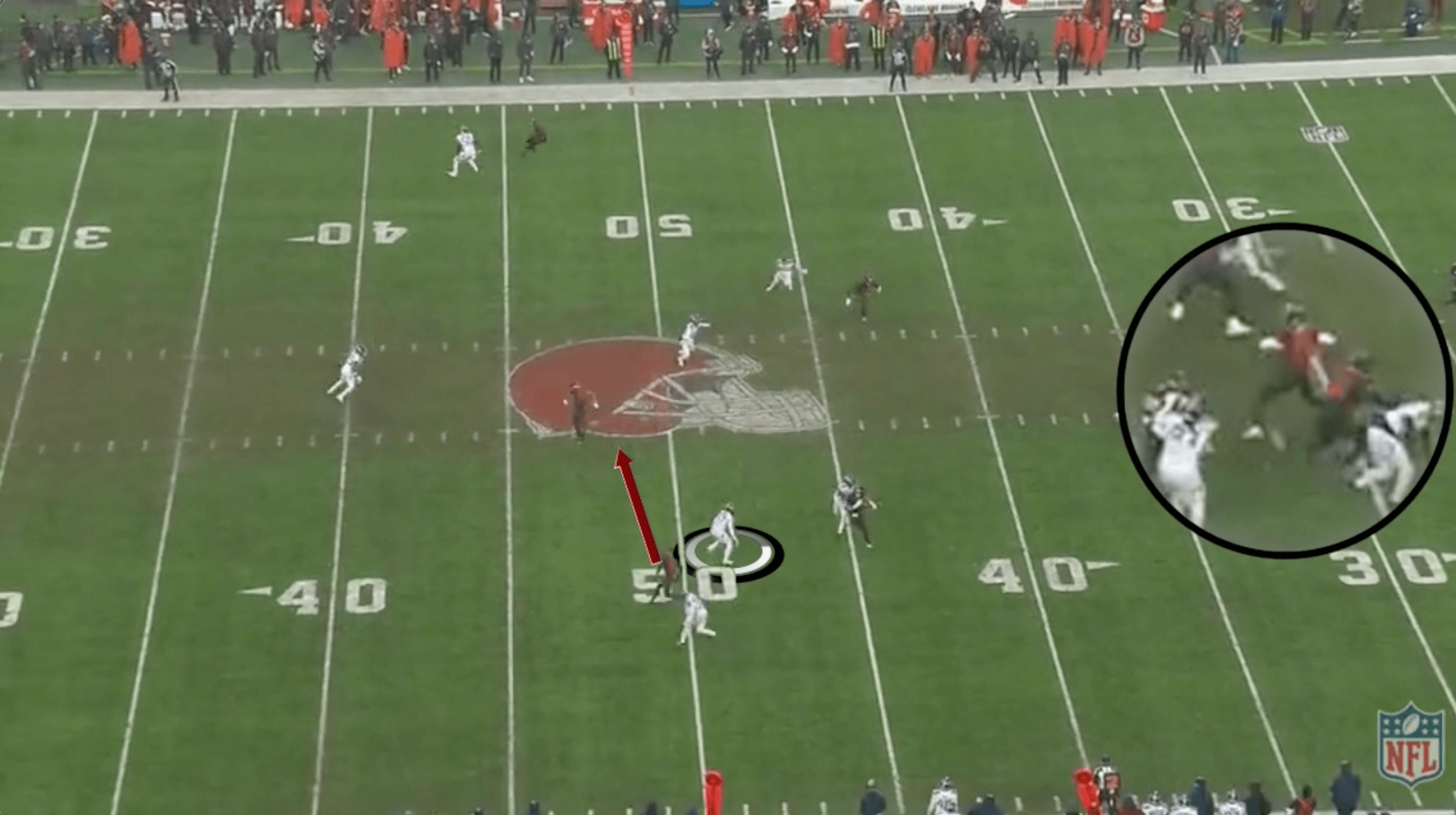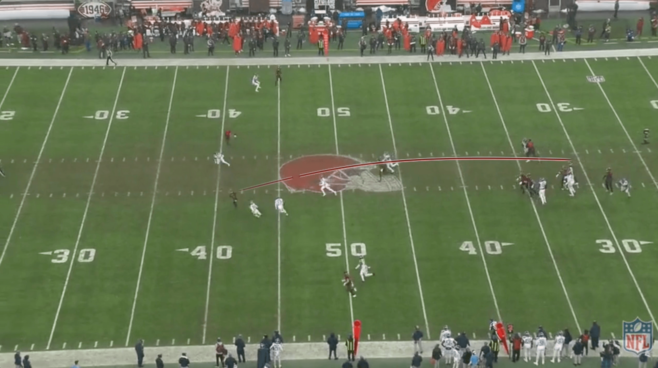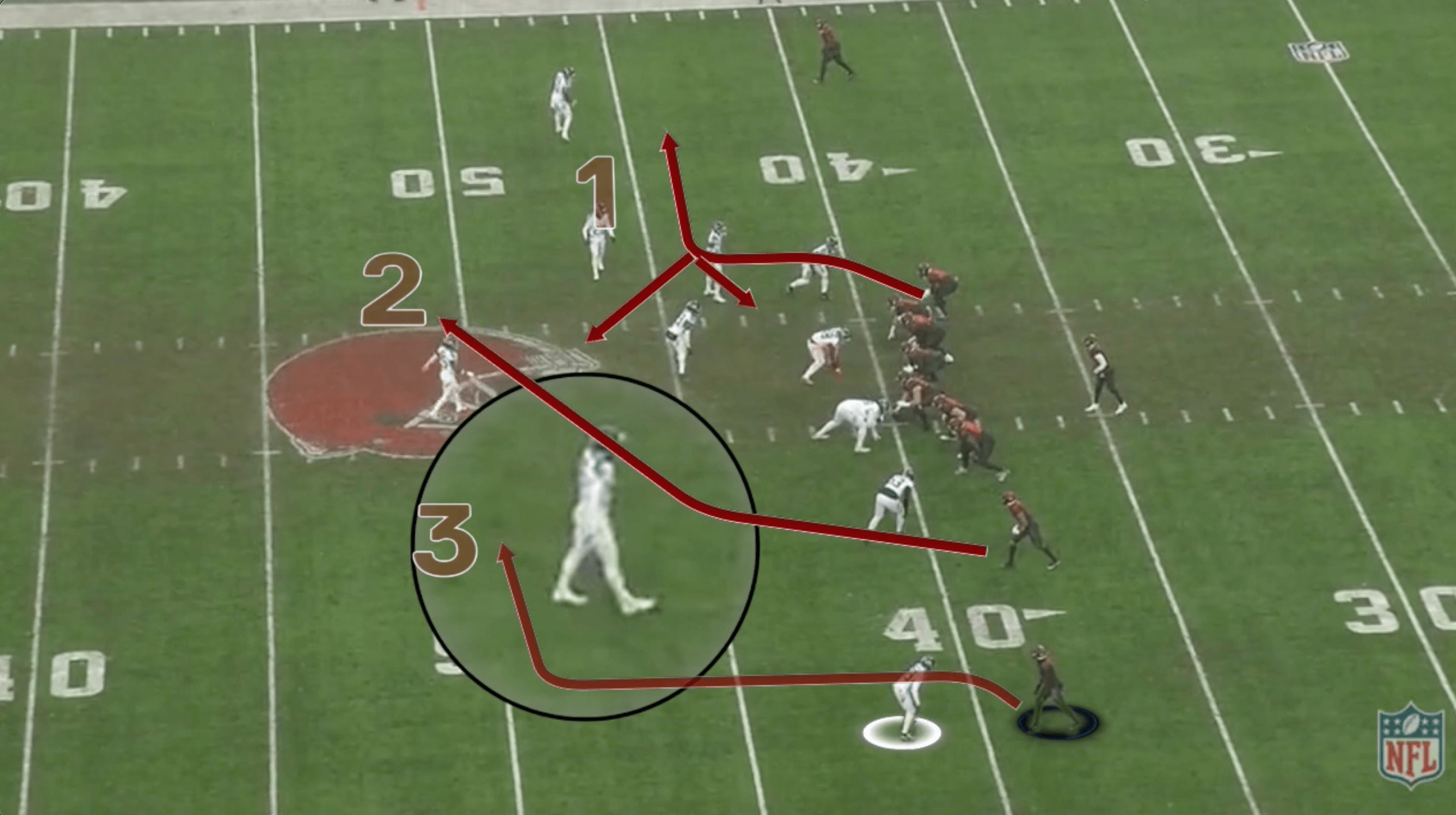 The Browns came out in an empty formation and the Titans made a coverage check, but the corner on Jeudy didn’t get the check and played man coverage while the rest of the defense played zone.