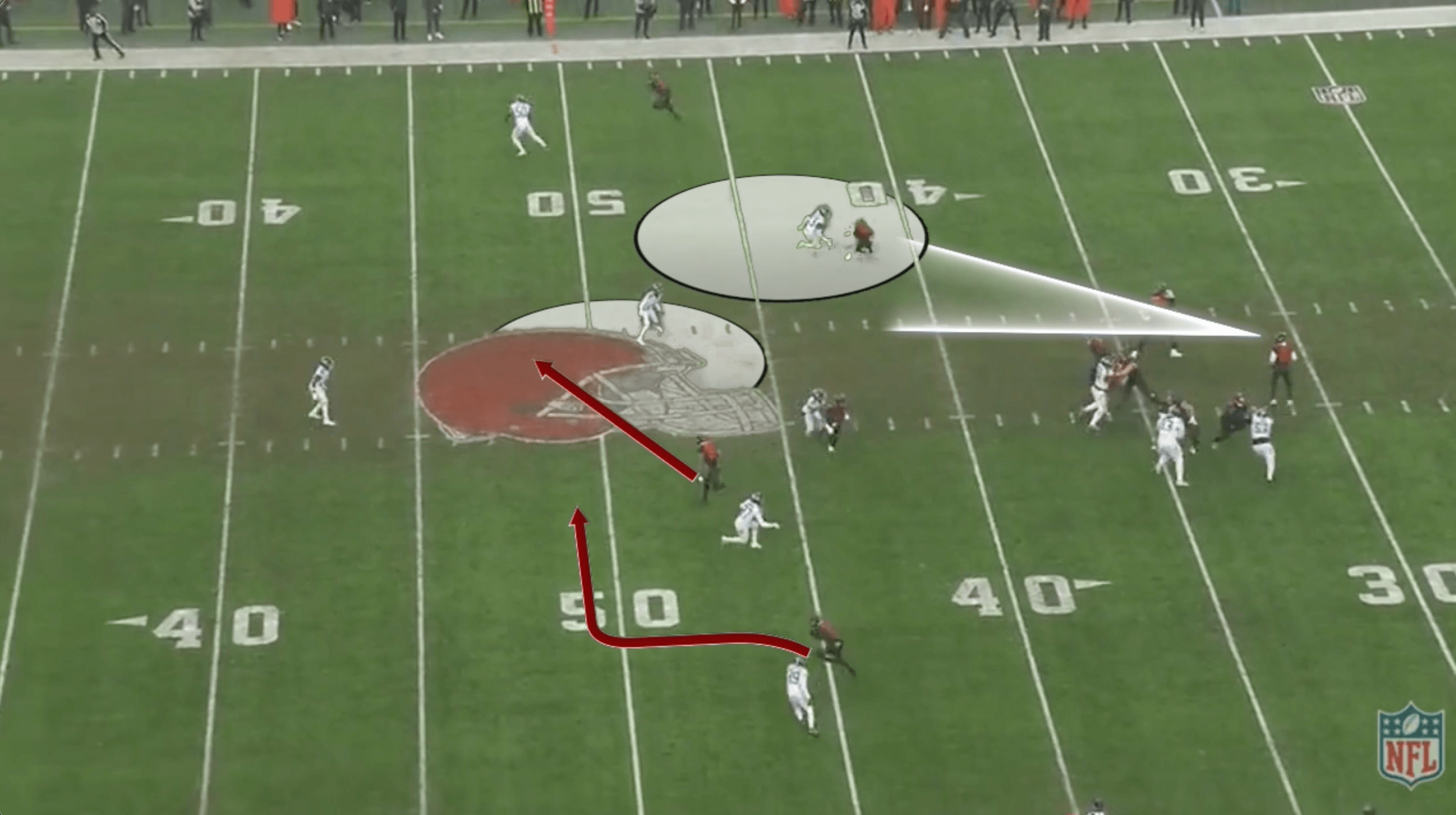 Rice ran an underneath route that triggered linebacker Henry To’o To’o to match up on him. The matchup is fine with the initial route distribution, but the issue arises if the quarterback scrambles and To’o To’o actually has to run with Rice, which is what happened.
