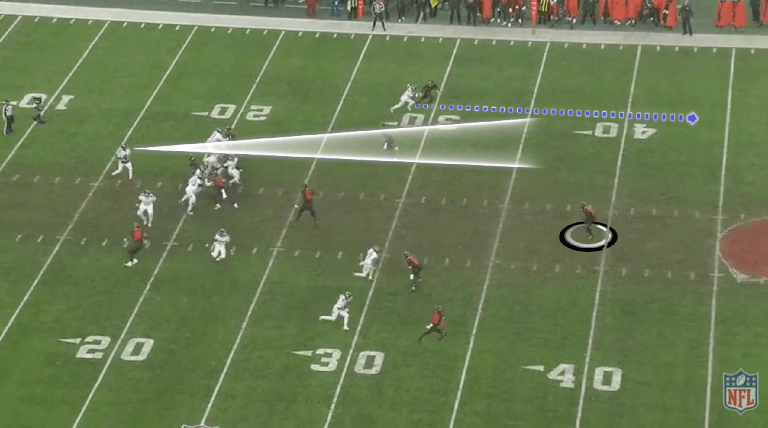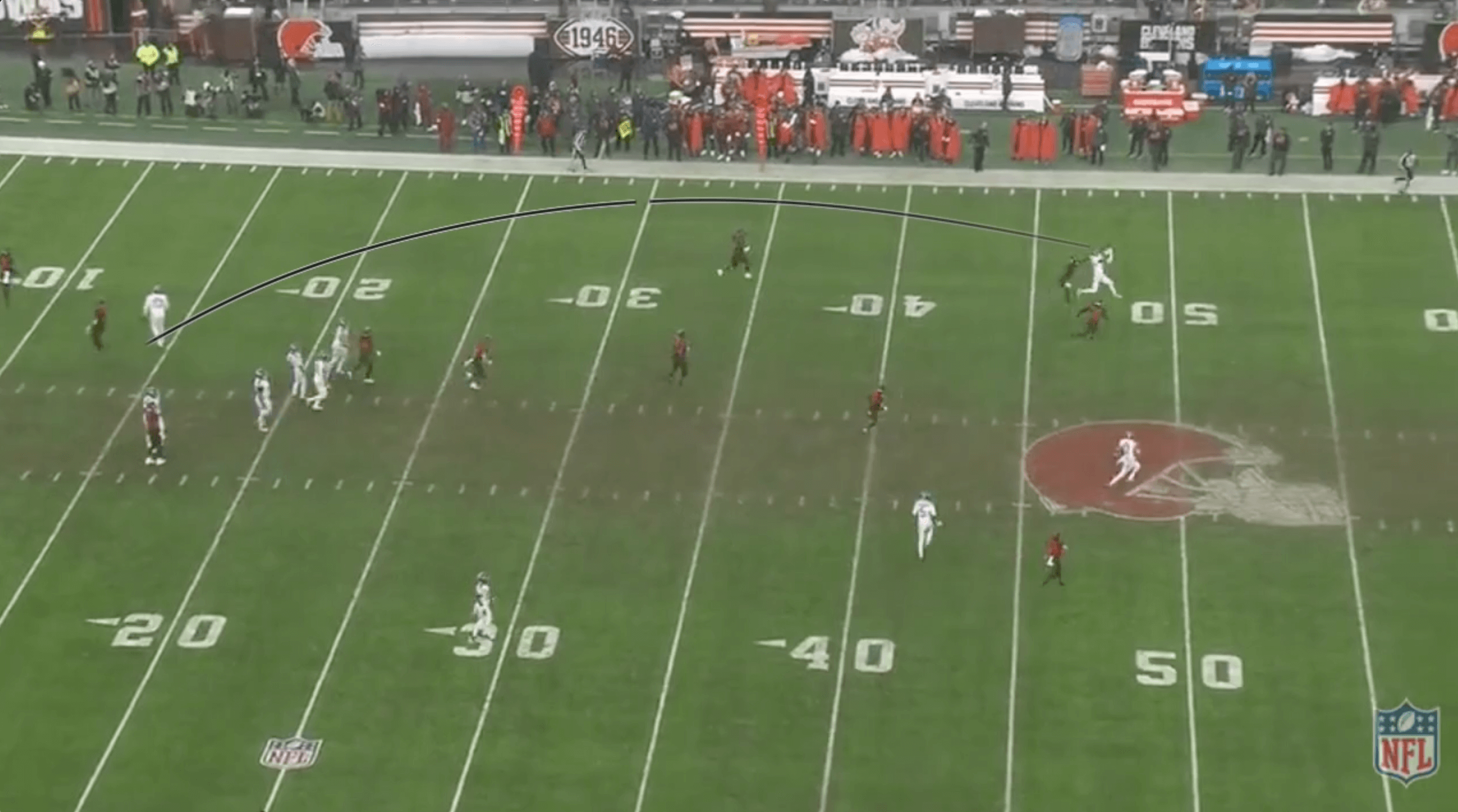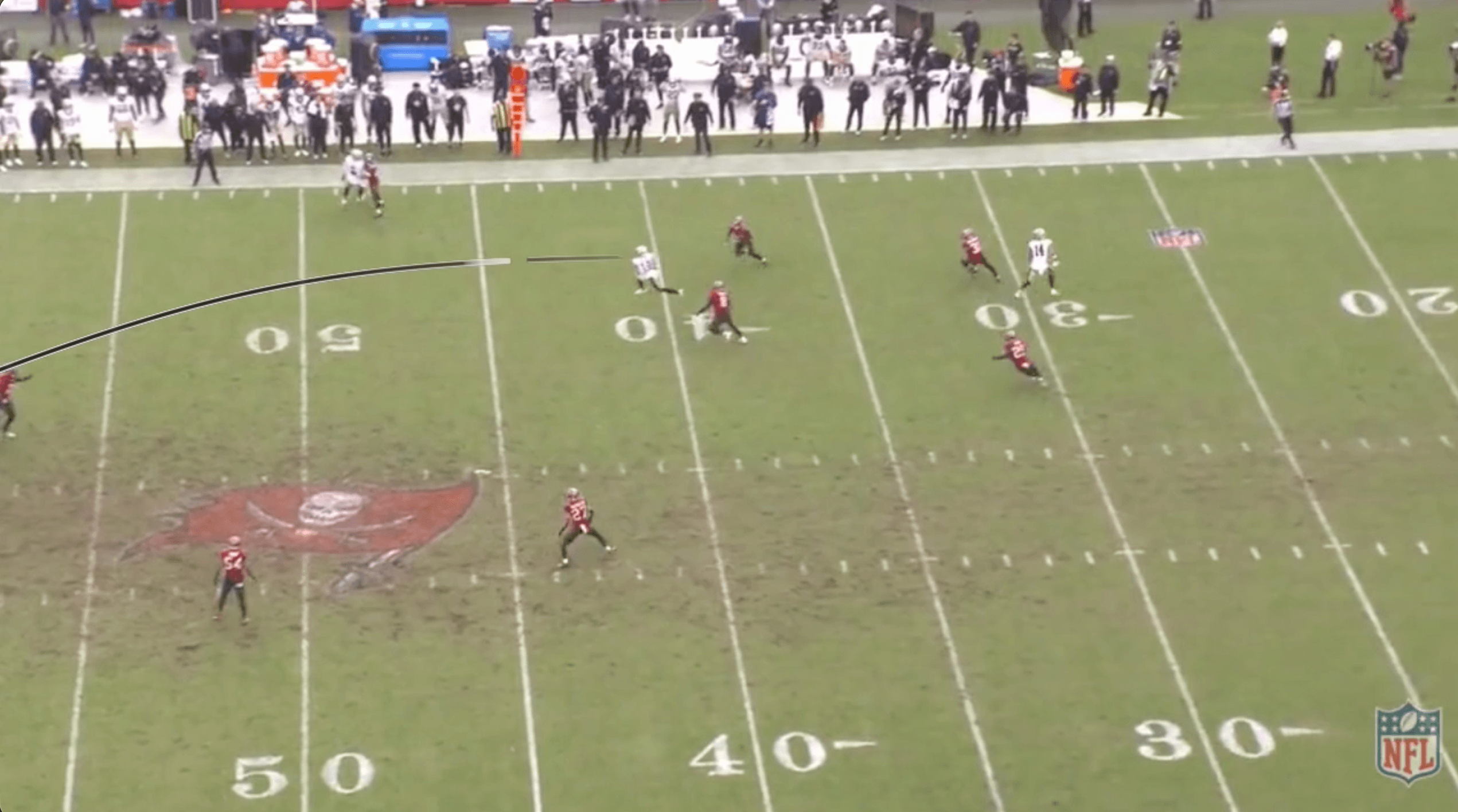 The Bucs were in quarters coverage with a “box” call. You can see why it’s called box, with four defenders forming the four corners. Olave did a good job of recognizing the zone and adjusting his route. Shough was on the same page and saw Olave coming out of his break slowly.