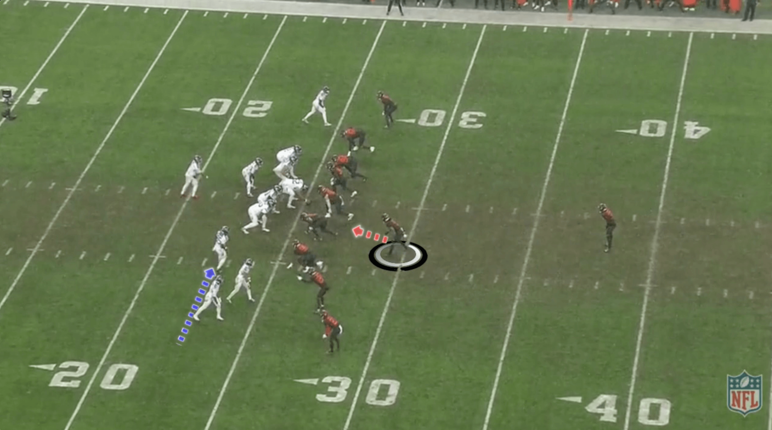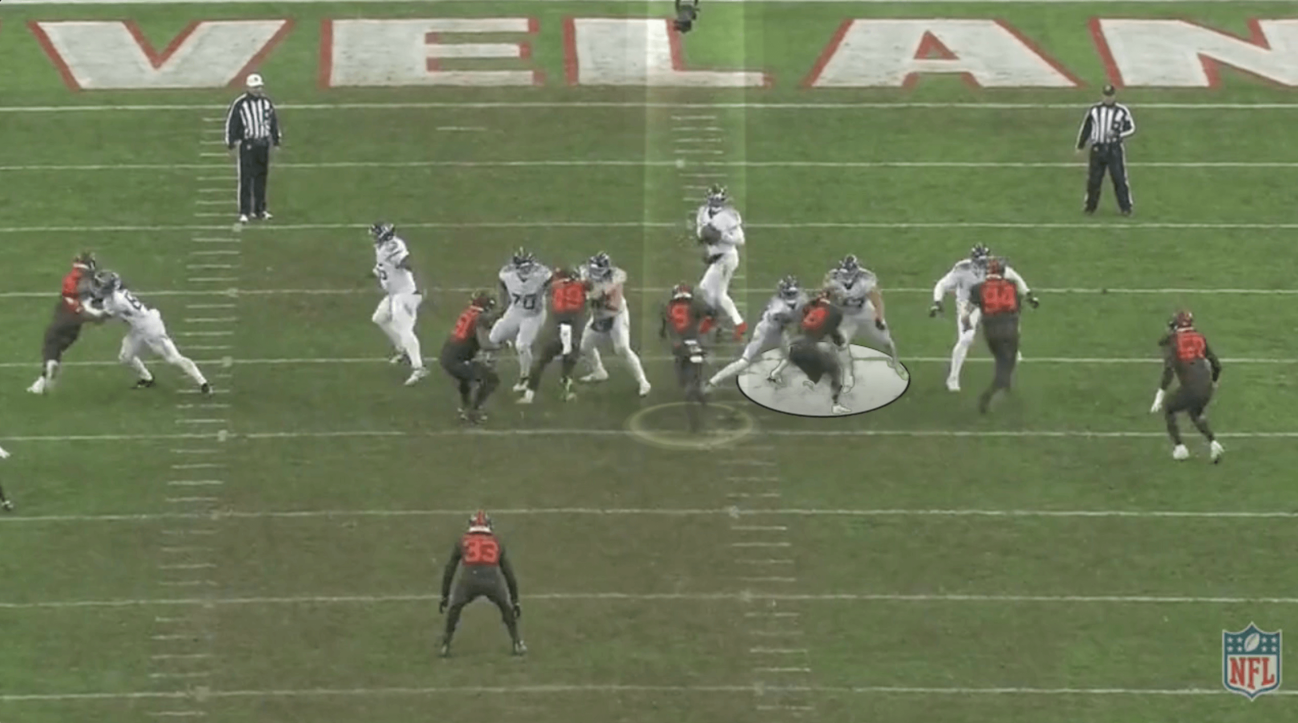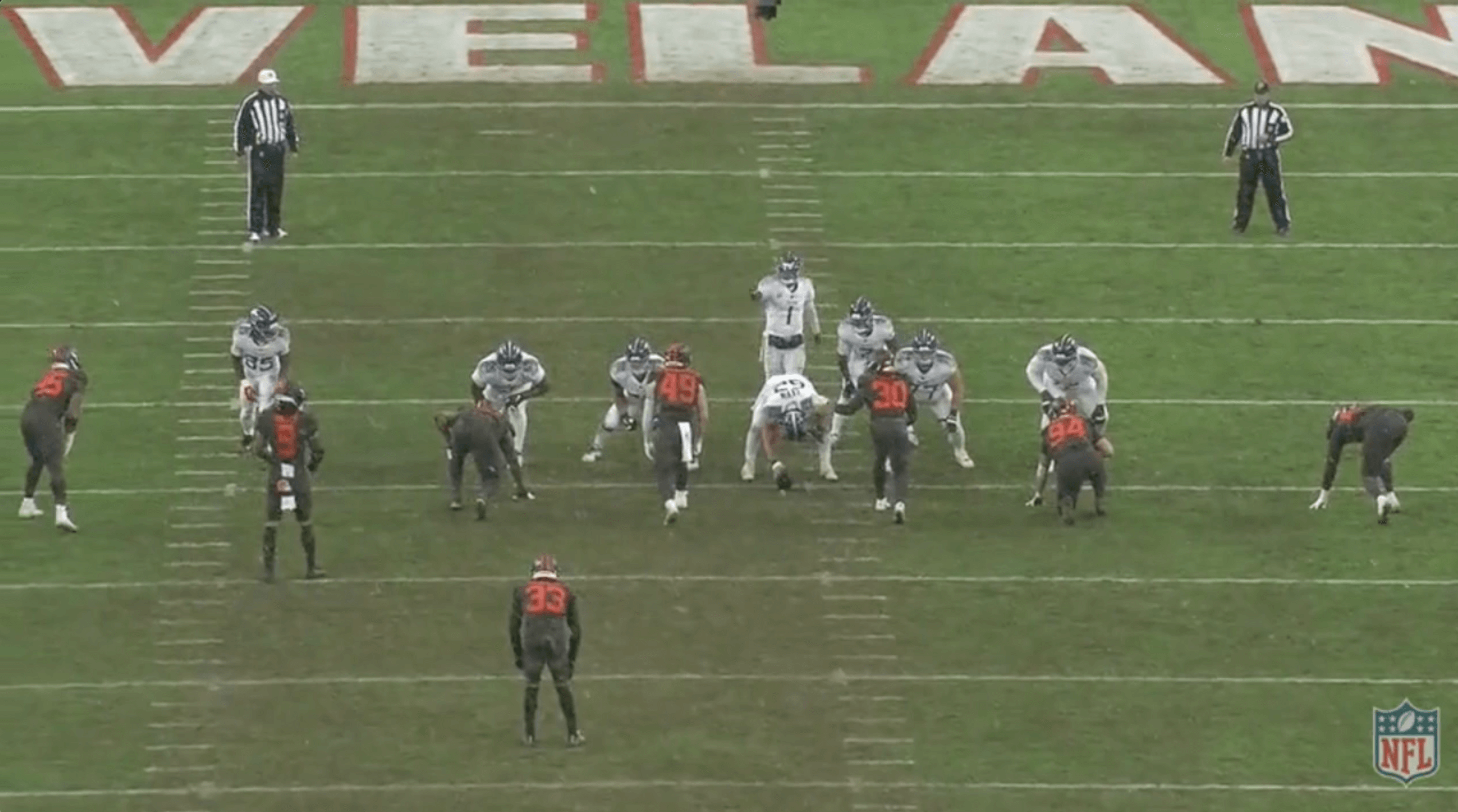 On third-and-8, the Browns showed heavy pressure with a double A-gap mug look. The Titans had three receivers lined up to Ward’s right. After Ward motioned a receiver inside, he sniffed out a blitz with safety Grant Delpit moving closer to the line.