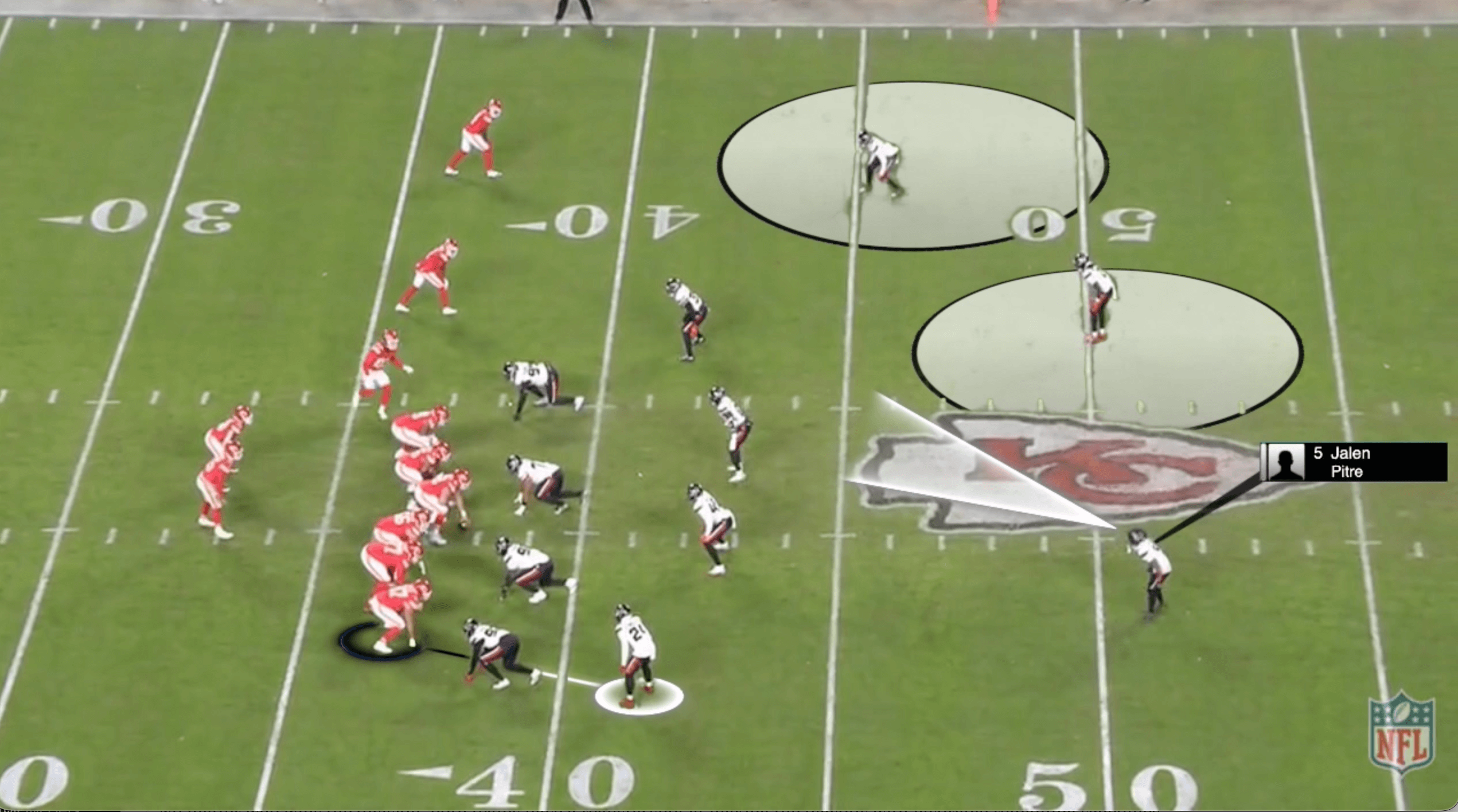 On the first-and-10, the Texans played quarters with man-to-man technique to Travis Kelce’s side, which freed up Pitre playing safety to “poach” or help with routes coming from the other side of the formation.