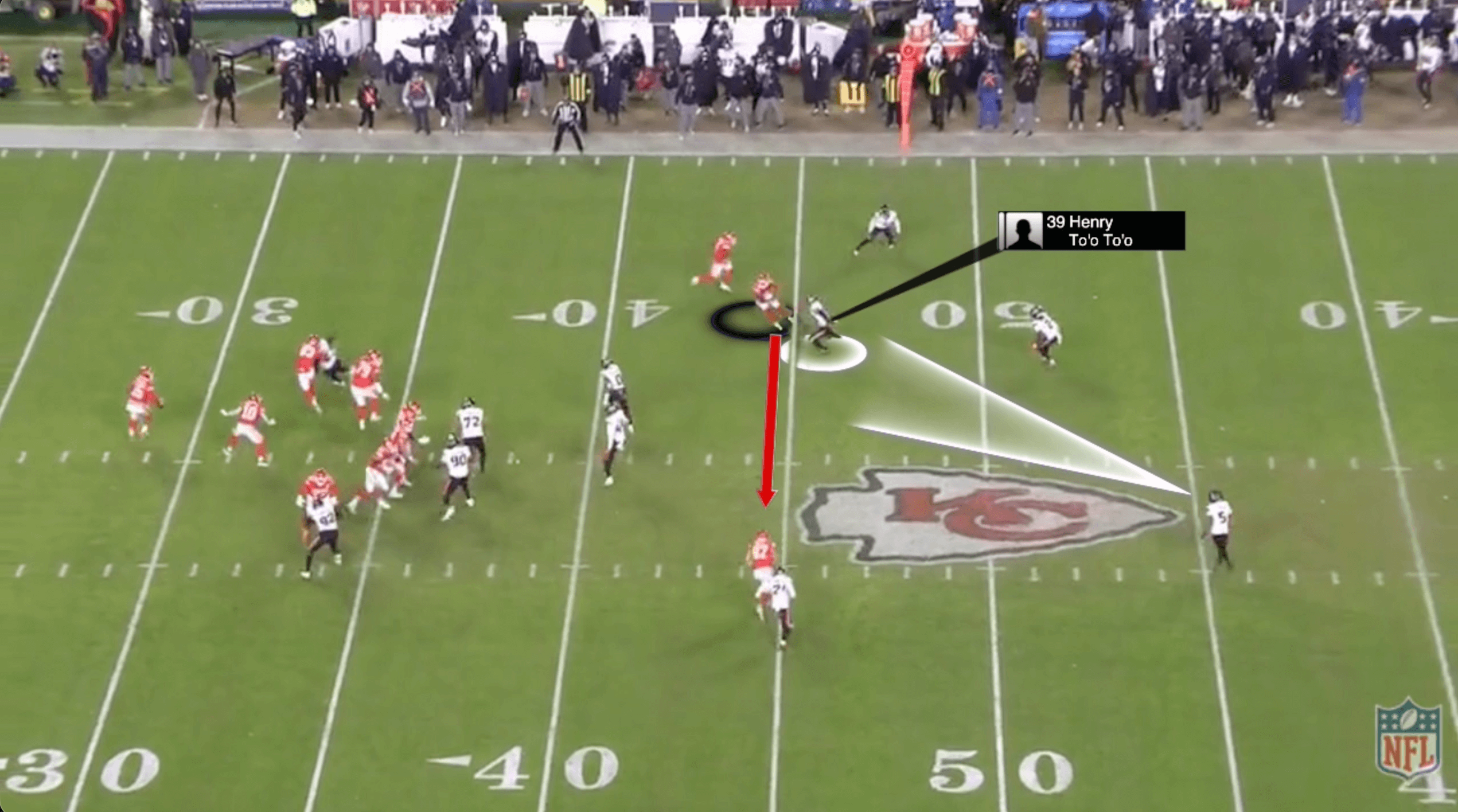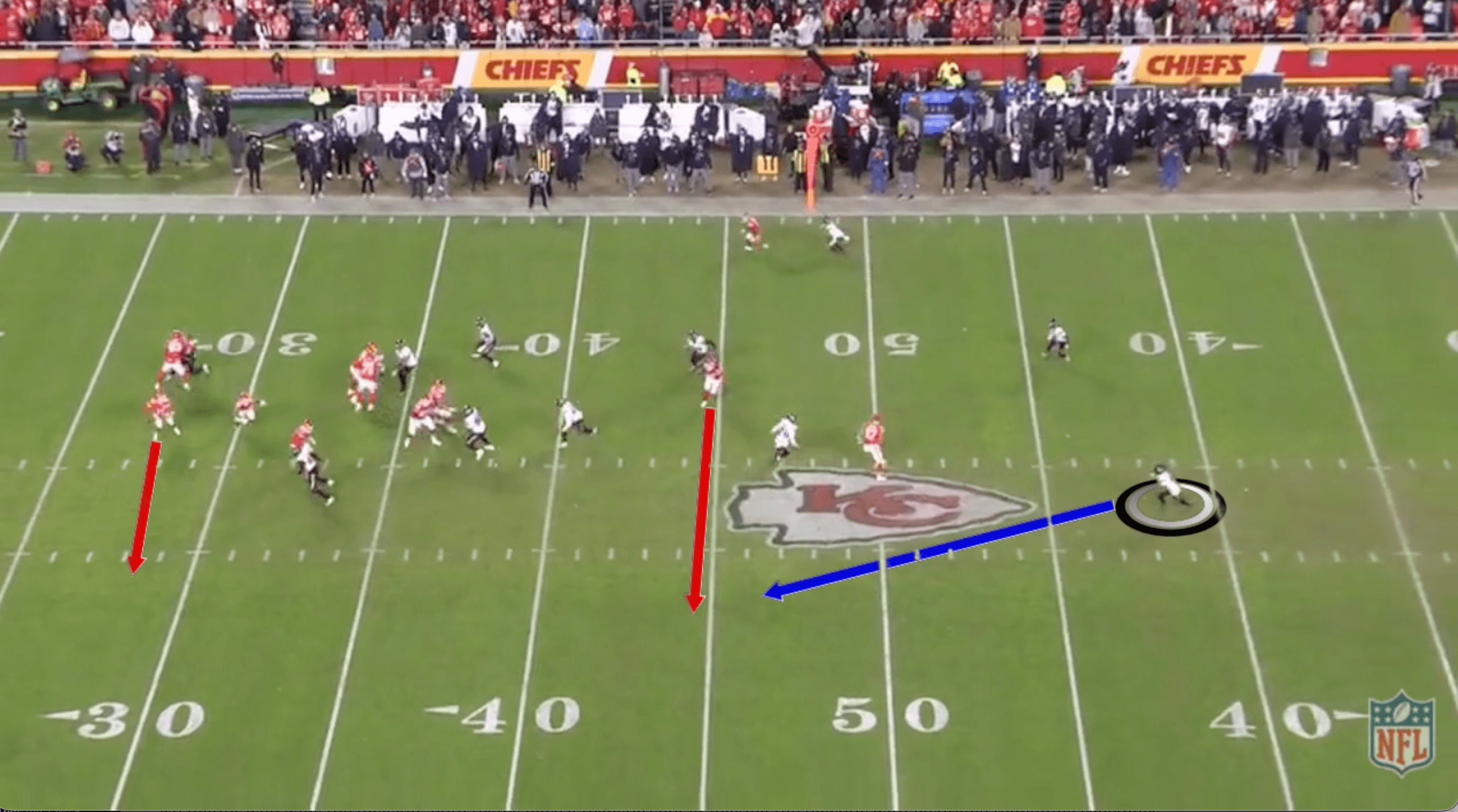 Patrick Mahomes reversed field and Rice took off with him, burning To’o To’o. Pitre saw this unfolding and came screaming off the roof to help To’o To’o.