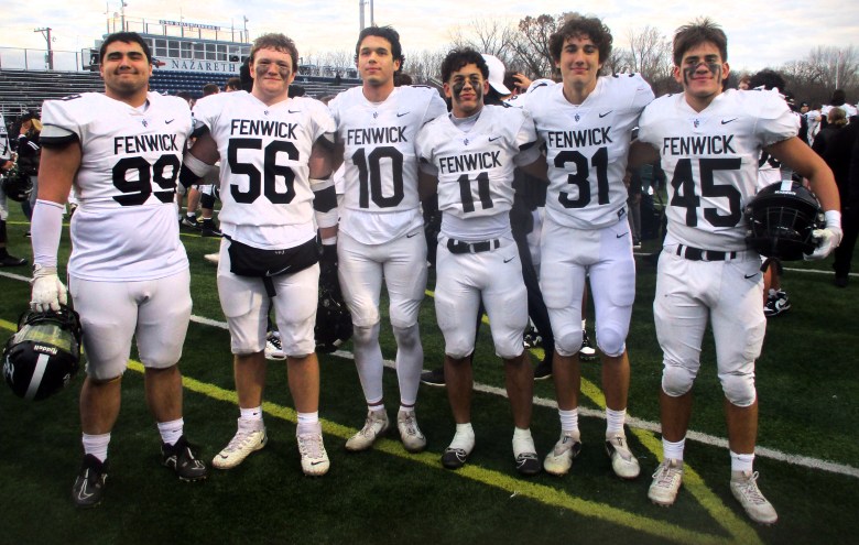 Fenwick football players Luke Leone (left), Connor Wahl, Will Tomczak, Odin Ferjak, Jack Rooney and Diego Robles, all from Riverside. Topher Polston is not pictured. (Bill Stone)