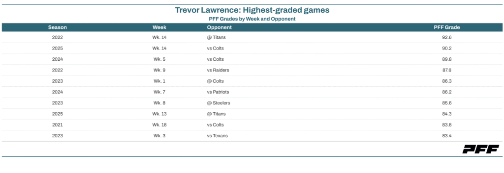 Trevor Lawrence is peaking at the right time: The former No. 1 overall pick earned a 90.2 PFF overall grade in Week 14, the second-highest single-game mark of his career. He has now stacked two impressive outings in a row and is the second-highest graded quarterback over the last two weeks.
