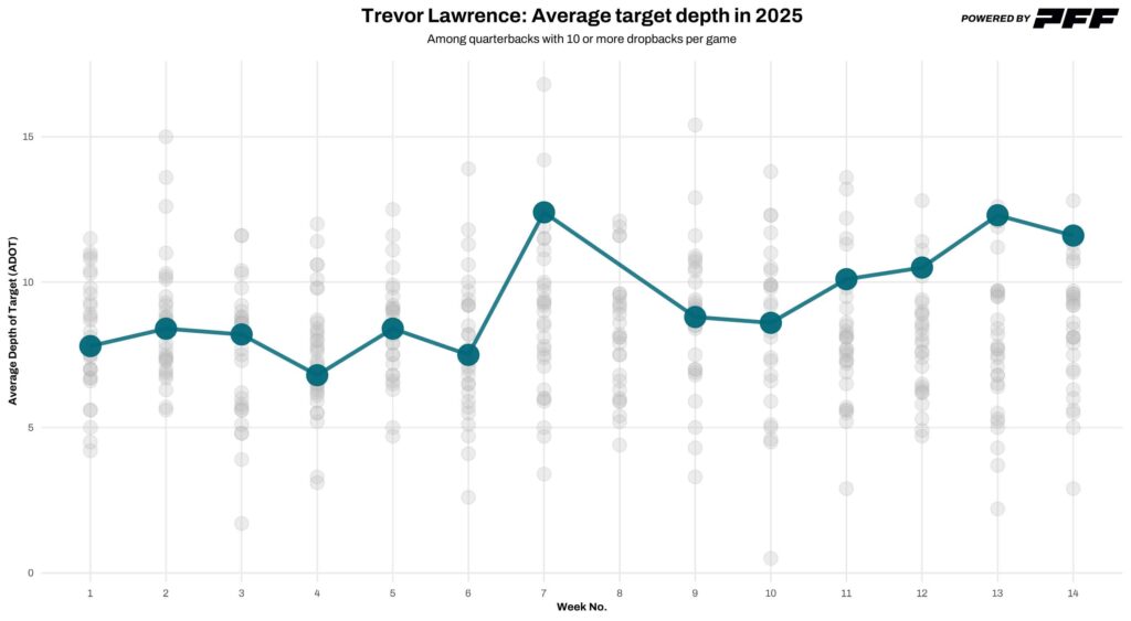 In the first four weeks, Lawrence recorded zero big-time throws and an average depth of target of just 7.9 yards — 21st in the NFL. Since then, he has produced 18 big-time throws and raised his average depth of target to 10.0 yards, both ranking top-five over that span.