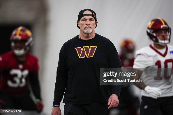 ASHBURN, VA – MAY 10: Head coach Dan Quinn of the Washington Commanders looks on during Washington Commanders Rookie Minicamp at OrthoVirginia Training Center on May 10, 2024 in Ashburn, Virginia. (Photo by Scott Taetsch/Getty Images)