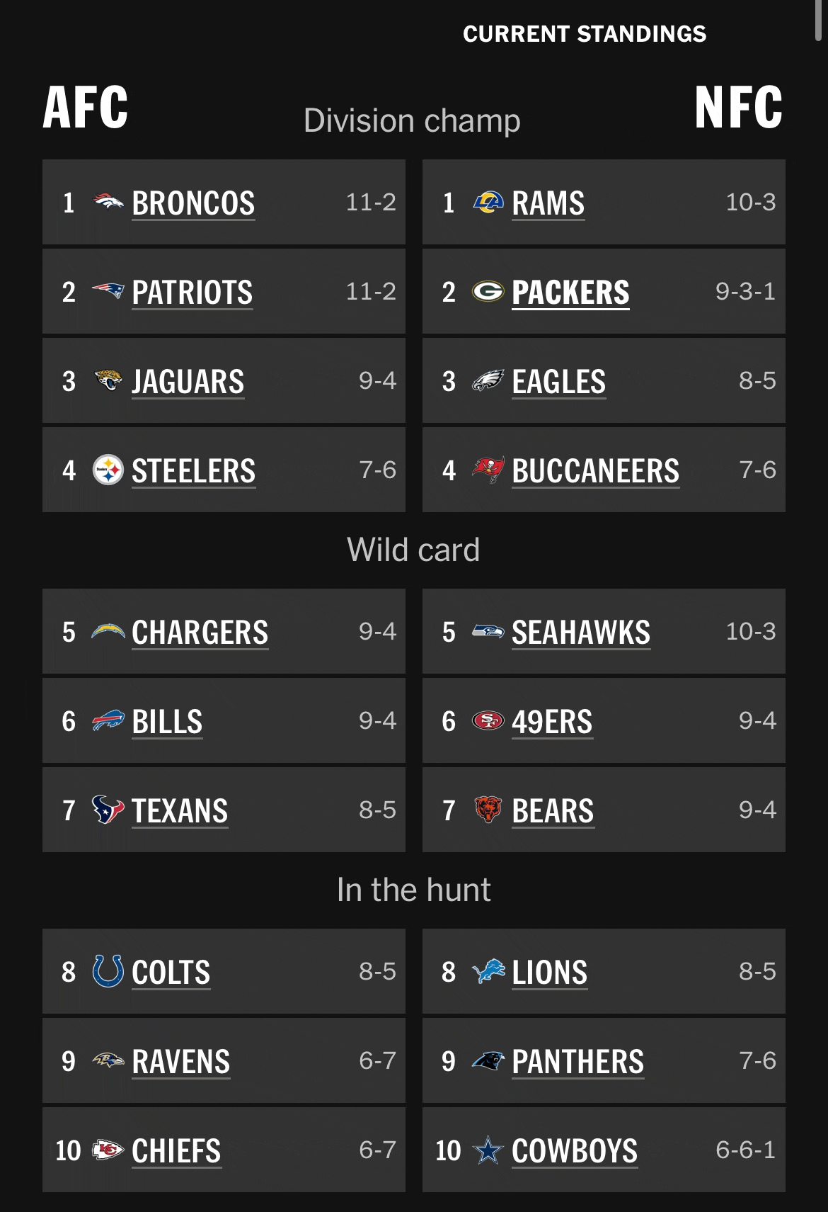 For the first time this season, every team currently in the playoff picture is also projected to remain there, in fact. In this GIF from the Simulator, the only difference between the current and projected standings is the AFC’s order of teams: