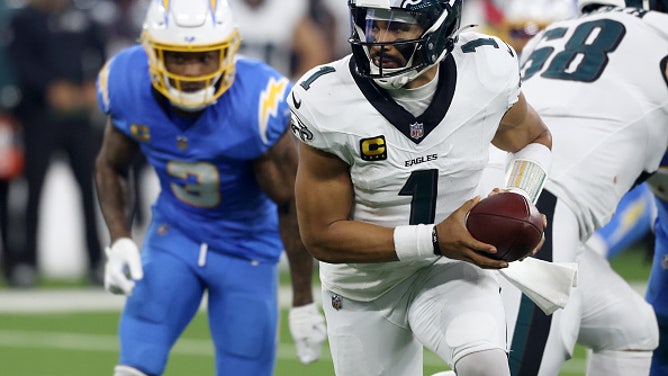 INGLEWOOD, Calif. – Jalen Hurts of the Philadelphia Eagles carries the ball against Derwin James Jr. of the Los Angeles Chargers during the second quarter at SoFi Stadium on December 8, 2025. (Photo by Katelyn Mulcahy/Getty Images)