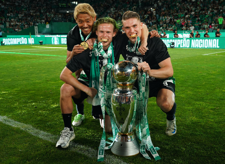 Hidemasa Morita (L) of Sporting CP and teammates Morten Hjulmand (C) and Viktor Gyokeres celebrate with the trophy after winning the Portuguese championship title in Lisbon on May 17, 2025. (Getty/Kyodo)